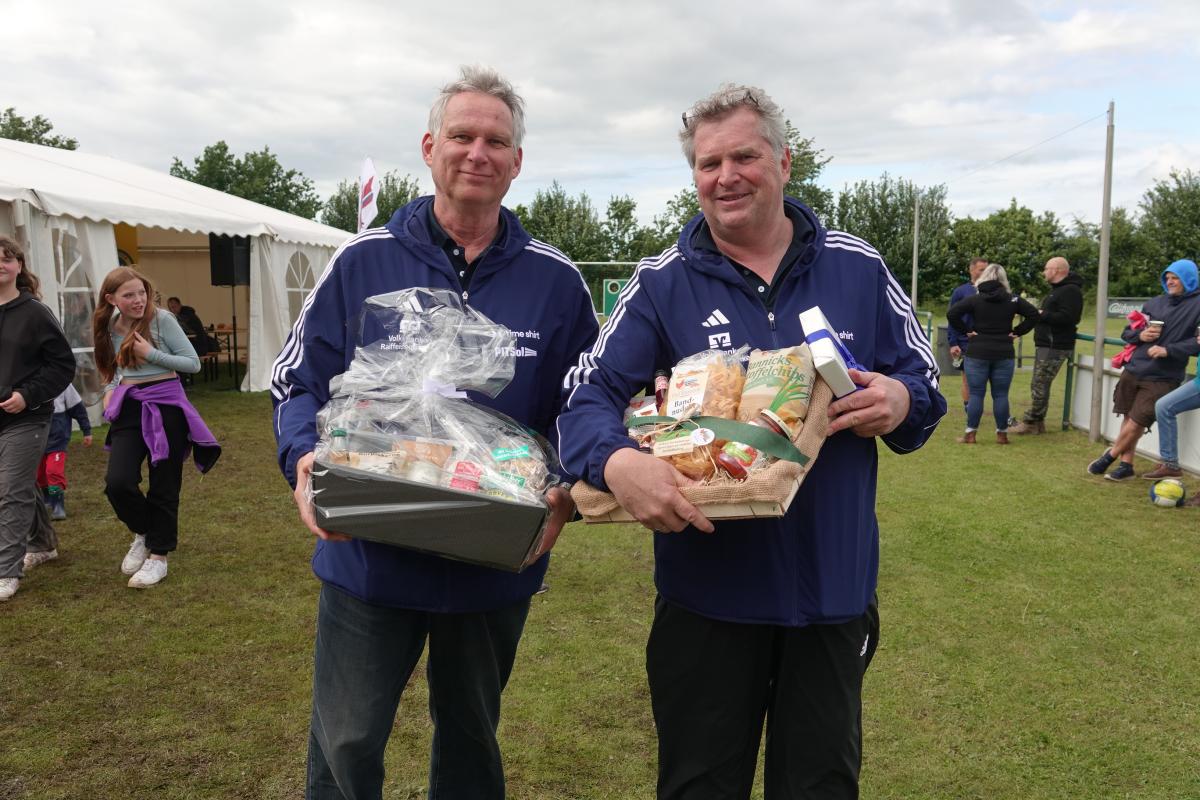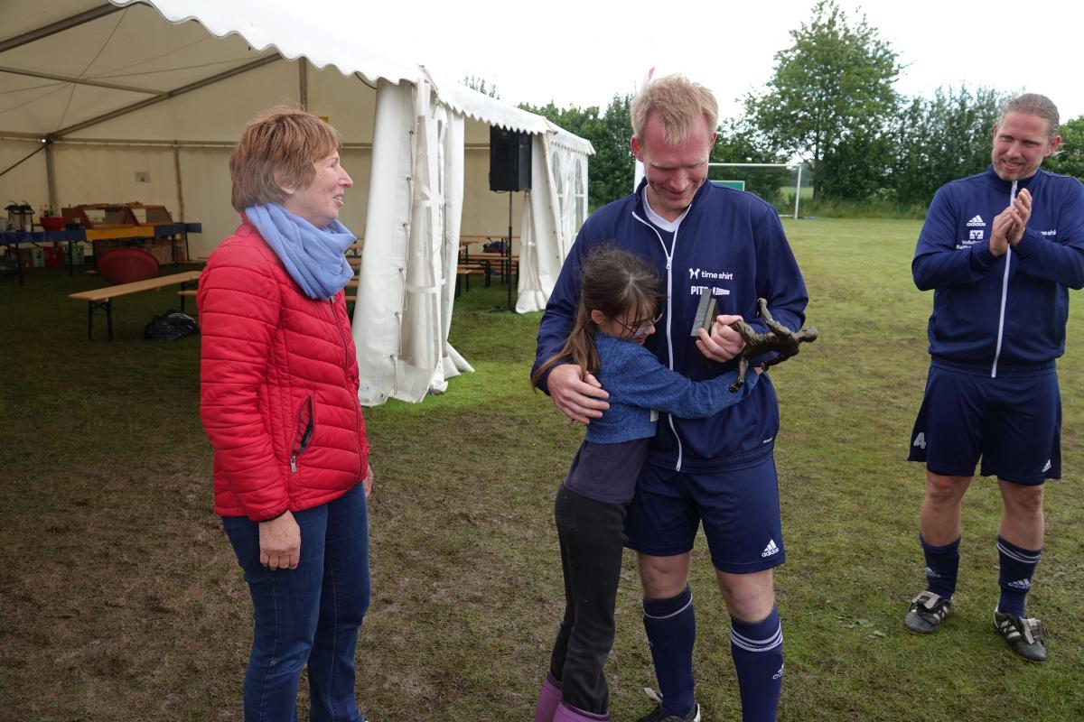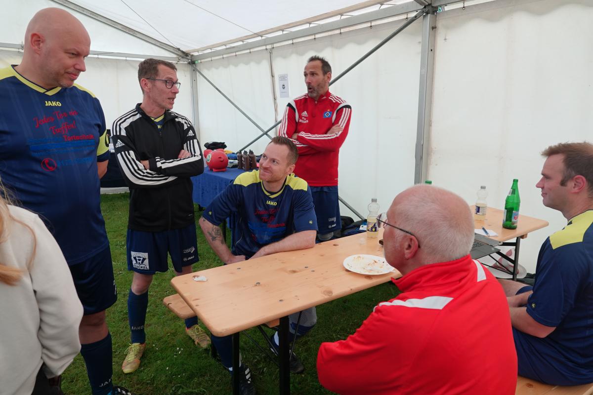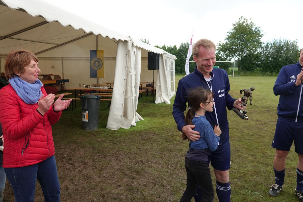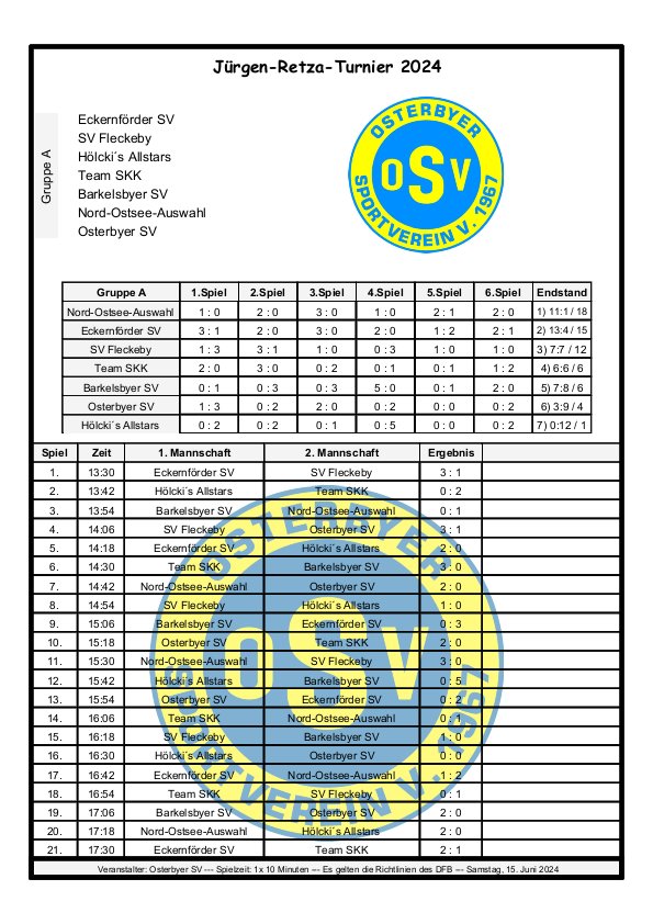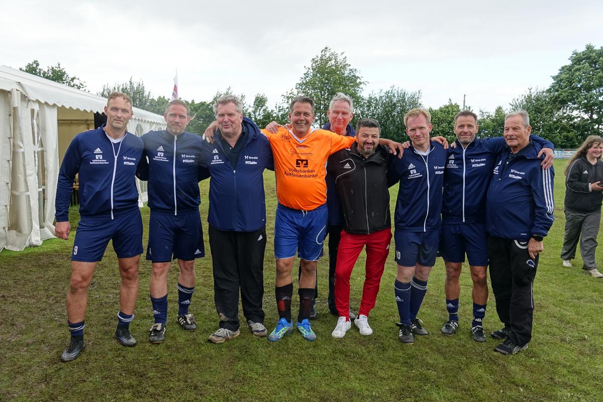 Das war das Jürgen-Retza-Turnier 2024 Aktuelles 30. Juni 202422. August 2024 Beste Unterhaltung und leckeres Spanferkel beim Jürgen-Retza-Turnier (JRT) In diesem Jahr behielt die Wettervorhersage leider in Teilen recht. Am Samstag, den 15.06.24, ergossen sich gegen 11 Uhr derart heftige Regenfälle, dass die Spiele der Jüngsten (G-Jugend/ bis 6 Jahre) bedauerlicherweise abgebrochen werden mussten. „Wir haben uns die Entscheidung nicht leicht gemacht und bei all den Vorbereitungen ist es sehr, sehr bedauerlich, aber letztlich waren sich alle einig. Der Regen war zu heftig.“ Alle sind nass bis auf die Knochen. Zum Wohle aller müssen wir abbrechen,“ untermauerte Lasse Retza die Entscheidung. Lasse Retza, zusammen mit Thorsten „Thermo“ Geyer Trainer der jüngsten Mannschaft, hatte es in Abstimmung mit der Staffelleitung des Kreisfussballverbandes geschafft, einen kompletten Spieltag der G-Jugend-Staffel in Osterby ansetzen zu lassen. Es waren 15 Jugendmannschaften vor Ort. Es waren 7 Spielfelder für die jüngsten Kicker aufgebaut, die mit jeweils 3 Spielern auf 2 Tore gegeneinander spielen. Alles war für einen tollen Auftakt zum JRT mühevoll und bestmöglich vorbereitet. Nach einer kurzen Begrüssung durch Lasse Retza starteten die Spiele wie geplant ab 10 Uhr. Die Freude und Begeisterung der jüngsten Kicker wurde dann jedoch jäh abgewürgt. Die immer heftiger werden Regenfälle wie oben angeführt ließen nur noch eine Abbruch zu. Zurück blieben entäuschte Spieler*in mit Eltern und Anhang, die sich nach kurzer Trocknung auf die Heimreise begaben, sowie zahlreiche Helfer, die für das leibliche Wohl und das organisatorische Gelingen des Spieltages sorgen wollten. Nach einer somit etwas längeren Pause begrüsste gegen 13.15 Uhr Thomas Wohlert als Ehrenpräsident unseres Osterbyer SV die Besucher und teilnehmenden Mannschaften des Alt-Herren-Anteils des JRT. Trotz kurzfristiger Absagen waren mit der Nord-Ostsee-Auswahl (NOA), dem Eckernförder SV, dem SV Fleckeby, dem Barkelsbyer SV, den Hölcki´s Allstars aus Hamburg sowie einem Team des Städtischen Krankenhauses Kiel 6 Mannschaften unserer Einladung gefolgt. Natöörlich stellten auch wir als Gastgeber eine eigene Mannschaft. Thomas resümierte kurz den Erfolg der bisherigen Turniere, erläuterte Anlass und Ziel der Veranstaltung und wünschte allen Beteiligten viel Spaß und einen fairen und respektvollen Umgang miteinander. In der Folge erklärte unser umtriebiger und sehr geschätzter Oldie-Obmann Helmut Schlaber den geplanten Spielplan und Spielmodus und verwies auf die erste Partie. Diese wurde pünktlich um 13.30 Uhr angepfiffen und endete 3:1 siegreich für den Eckernförder SV gegen SV Fleckeby. Bei 7 Mannschaften sollte jeder gegen jeden spielen. Zur Freude der Zuschauer gab es auch immer wieder technische Kabinettstückchen und herrliche Spielzüge mit erfolgreichem Torabschluss zu sehen. Nach 47 Toren in 21 Spielen wurden dann die Platzierungen ermittelt. Mit 18 Punkten und 11:1 Toren behielt lediglich die NOA eine weiße Weste. Die NOA gewann all ihre Spiele und wurde verdientermaßen erneut zum Sieger des Turnieres. Vor der Siegerehrung wurden die Gewinner der abwechselungsreichen Tombola bekanntgegeben und konnten sich ihre Preise aussuchen. Die Tombola sowie das ganze Geschehen am Nachmittag moderierte unterhaltsam und informativ in sehr sympathischer Art Maike Jäger sehr erfolgreich. Maike taufte schnellentschlossen das Spendeschwein auf den Namen „Henriette“ und ließ nicht locker, die Besucher zum Füttern von Henriette zu animieren. Und das gelang Maike sehr erfolgreich. Allein Henriette hat mit über 270,-Euro für den guten Zweck beigetragen. Ebenso haben die animierenden Ansagen von Maike kräftig zum Kauf der Tombolalose beigetragen. Sensationelle 430,-Euro sind durch die Tombola für den guten Zweck zusammengekommen. Ein toller Erfolg dank der Unterstützung von Maike. Auch in diesem Jahr ließ es sich Jutta Retza nicht nehmen, das Turnier zu begleiten. Mit weiteren Familieangehörigen genoss sie den spannenden Fussball, die Treffen mit vielen Bekannten und die guten Gespräche. Ebenso übergab sie erneut den Siegerpokal an die NOA. Nach dem Abschuss des Turniers verweilten die einen noch gerne bei perlenden Getränken und guten Gesprächen und die anderen – wegen der langen Fahrt – verließen uns etwas frühzeitiger. Allen gleich war das gute Gefühl hier bei uns in Osterby in bester Stimmung zu der Spende für den guten Zweck beigetragen zu haben und allesamt freuen sich auf die Einladung im nächsten Jahr. Der gesamte Spendenbetrag für die Mukoviszidose e.V. Schleswig-Holstein stand zum Redaktionsschluss noch nicht fest und wird nachberichtet. Sehr wohl kann ich aber bereits die stolze Summe von 3.025,- Euro als Spendesumme auf dem MuKo-Konto präsentieren. Diese Spendensumme wurde unter dem Stichwort „OSV-JRT24“ bis Stand 21.06.24 gespendet. Mein ganz großes DAAANKE geht an alle Helfer*innen und Unterstützer*innen, die durch ihren Einsatz den Erfolg des JRT erst möglich machen. Das ganz besondere DAAANKE ist für Basti Steinig für das sehr leckere Spanferkel, dass du uns bereitetest hast und die vielen Stunden, die du dafür in der Vor- und Nachbereitung investierst hast. Alles für den guten Zweck zu Gunsten der Mukoviszidose e.V. Schleswig-Holstein. Andreas Kern DSC01286 (1) DSC01258 DSC01288 DSC01260 DSC01293 DSC01261 DSC01296 DSC01262 DSC01263 DSC01297 DSC01300 DSC01265 DSC01302 DSC01267 DSC01303 DSC01268 DSC01305 DSC01269 (1) JRT 20240001-00 DSC01274 « ‹ von 2 › »